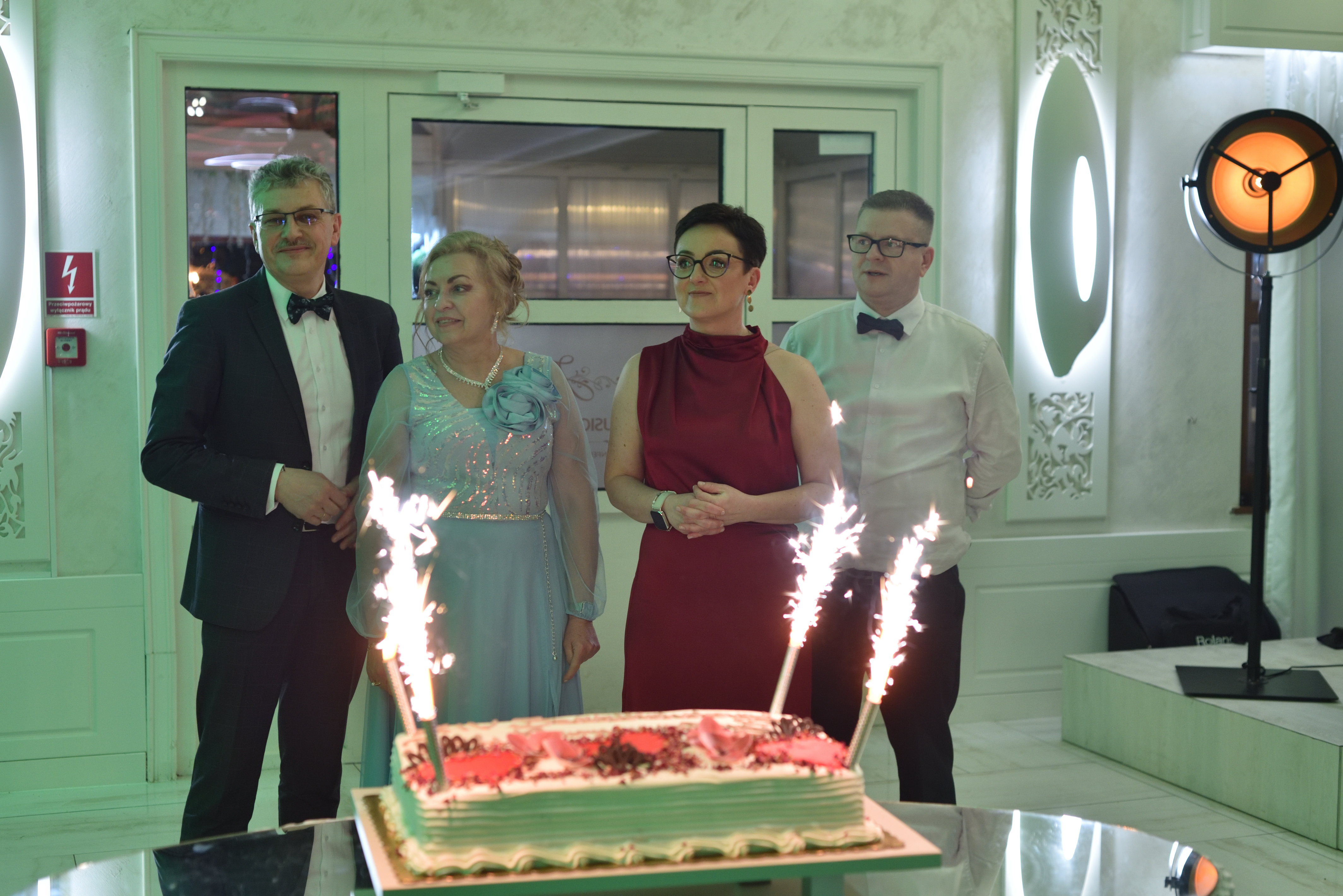 Po północy na salę wjechał tort. Nie mogło zabraknąć dodatkowej atrakcji- quizu z nagrodami, który przygotowali i poprowadzili Tomasz, Jan i Krzysztof.